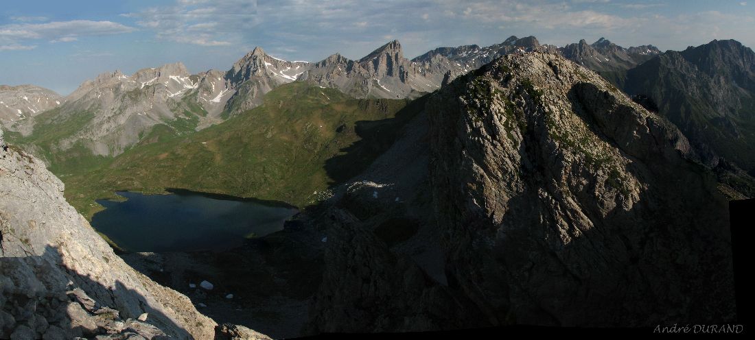 Depuis la crête menant au pic de Laraille, le lac (ibon) d'Achérito dominé par le pic d'Achérito, suivi par Pétragène, Ansabère, Trois Rois, Anie, Billare.