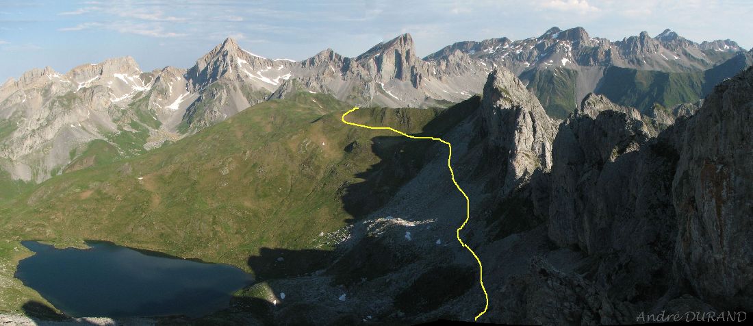 Un fois en bas du couloir, une sente à peine visible cour en traversée pour rejoindre le col 1991m.