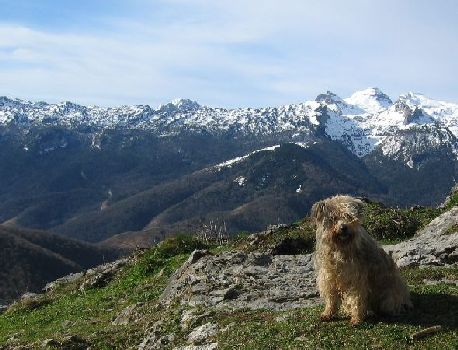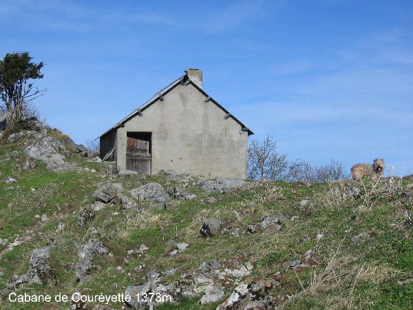 Maya, en pose sur fond de pic d'Anie La cabane de Couréyette est sur la crête, et au débouché, ....