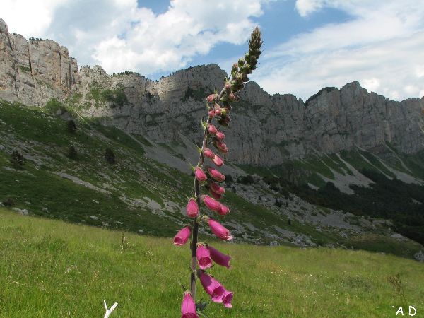Sur le chemin de descente, une digitale esseulée sur fond d'Orgues de Camplong.