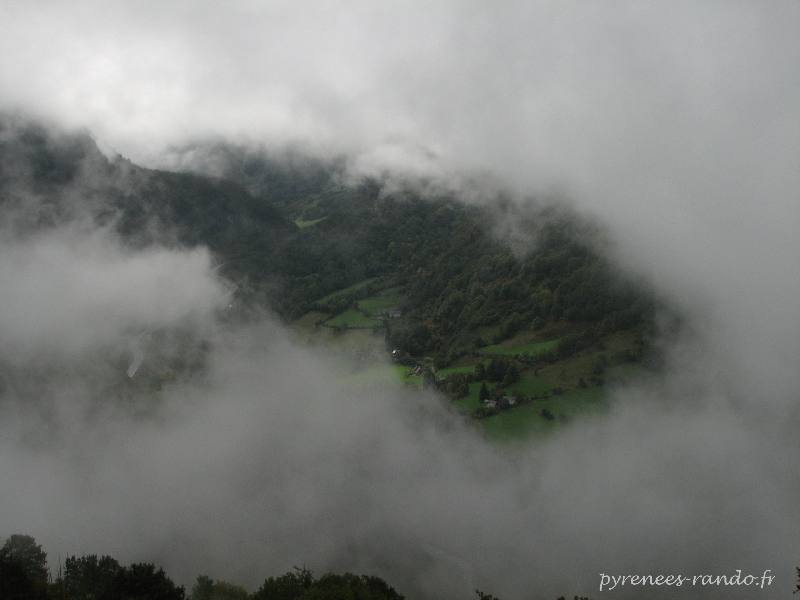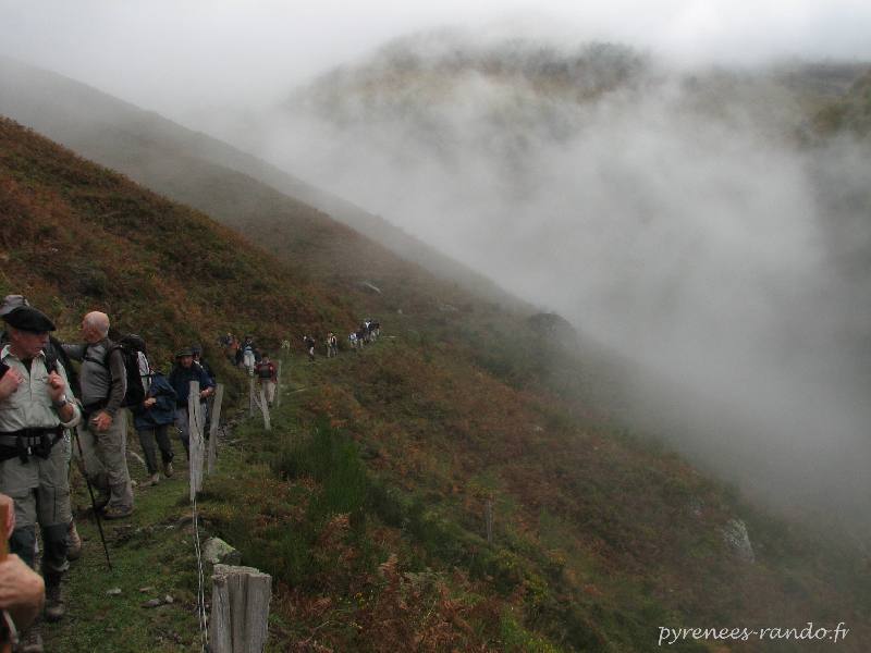 Sentier en balcon au dessus d'Urdos, le brouillard nous enveloppe.