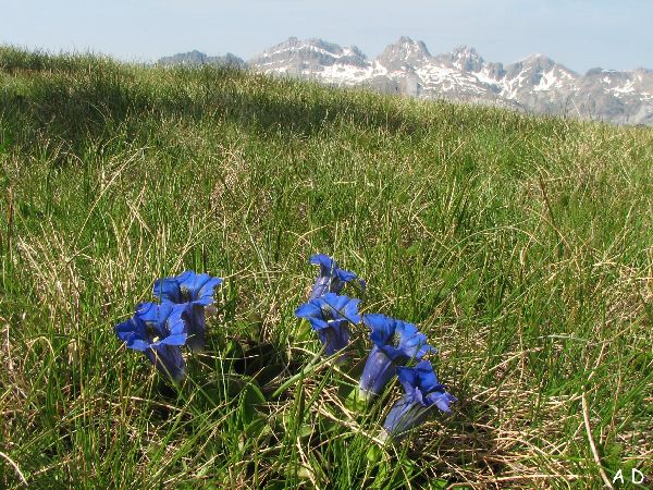 Un bouquet de gentianes avec en fond le pic d'Aspe.