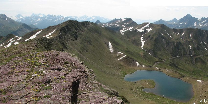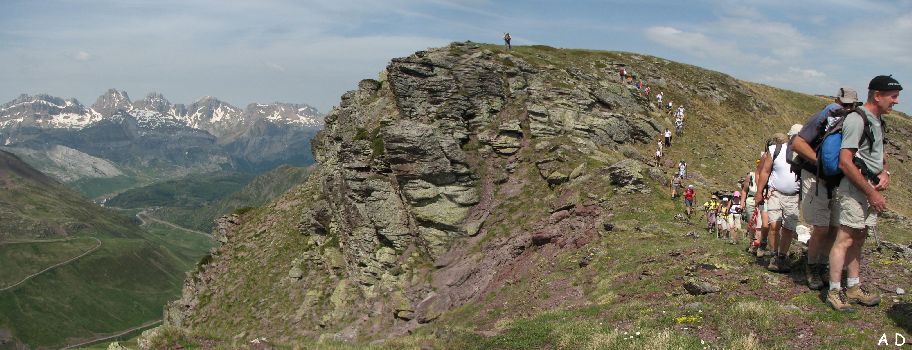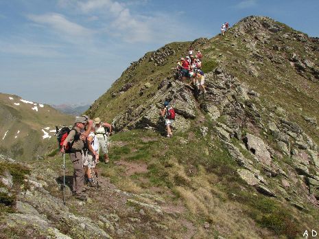 La crête frontière n'oppose pas de difficulté sur le flanc français. Mais soudain la colonie s'arrête et contemple des isards avec leurs petits qui détalent juste un peu plus bas.