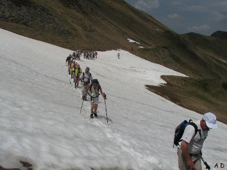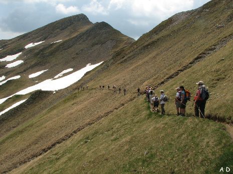 Le temps se brouille. Nous prenons la sente qui traverse sous la crête et permettra au groupe de traverser...