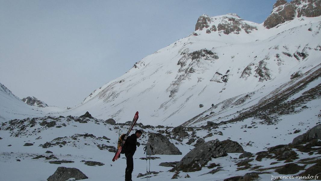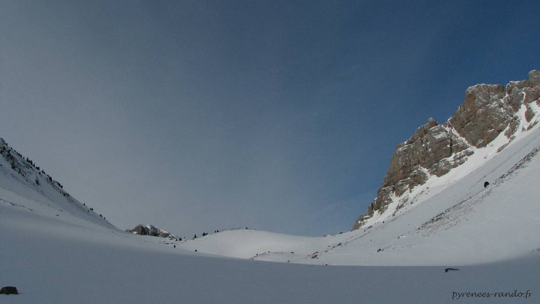 La cabane est derrière ce premier monticule, la vue s'ouvre sur le vallon d'Anaye, en haut à droite le pic d'Anie.