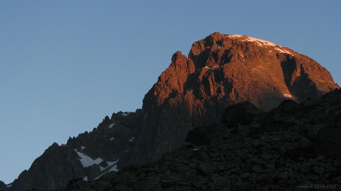 6h35, au dessus de la cabane de la Glère, le soleil se lève sur le rein de Pombie.