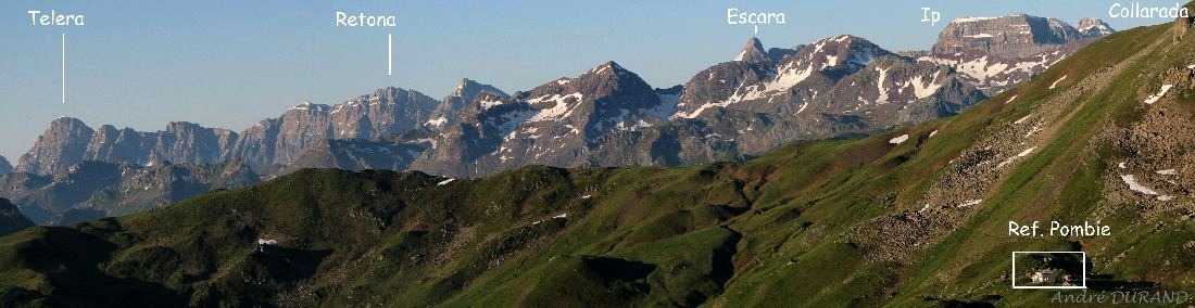 Les sommets espagnols émergent au dessus de la crête (peña Telera, Retona, Escara, Ip, Collarada, ...).