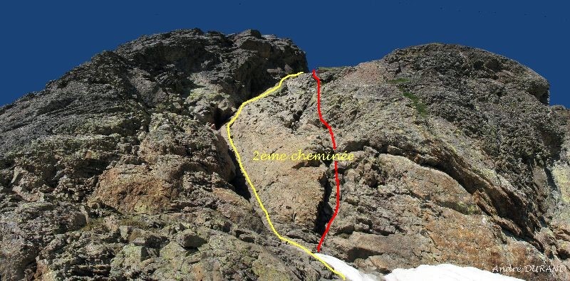 Puis la 2ème cheminée arrive, la plus technique. L'itinéraire rouge, plus aérien, est plus facile car pourvue de nombreuses prises malgré l'attirance de l'itinéraire jaune qui rassure car dans la cheminée.