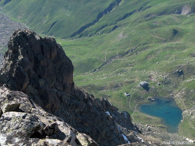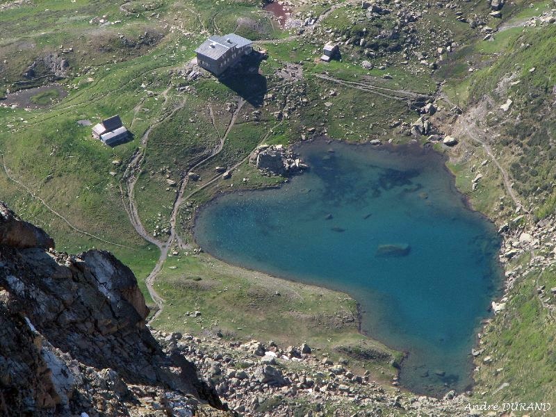 Pointe d'Aragon, refuge et lac de Pombie 700m plus bas.