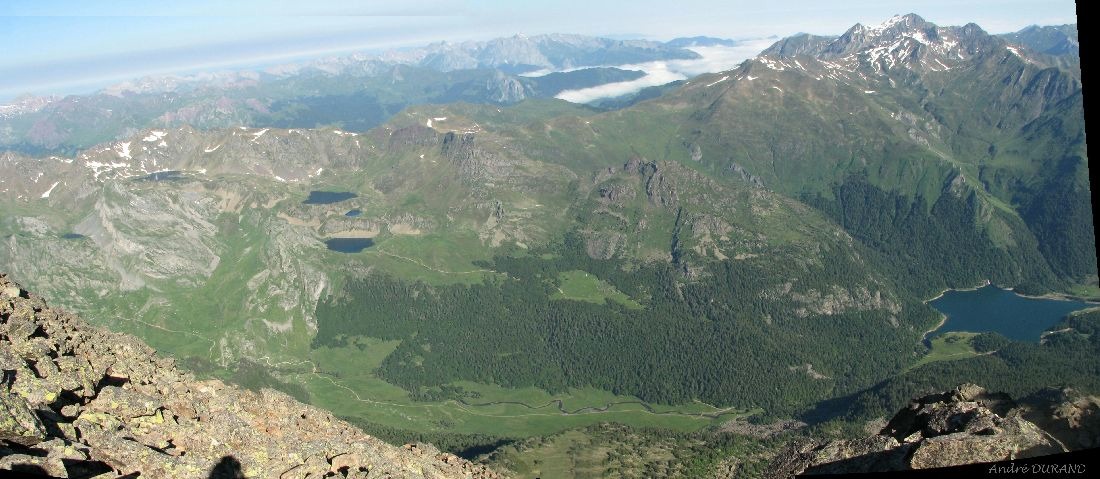 A l'Ouest, les lacs d'Ayous (Bersau, Gentau, Mey, Roumassot, Paradis, Castérau) et à droite le barrage de Bious Artigue dominé par le pic de Sesques.
