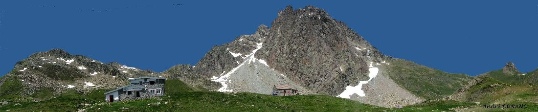 Pic et col de Peyreget, petit et grand pic du Midi d'Ossau avec la pointe d'Aragon qui semble être le point culminant et au premier plan, le refuge de Pombie.