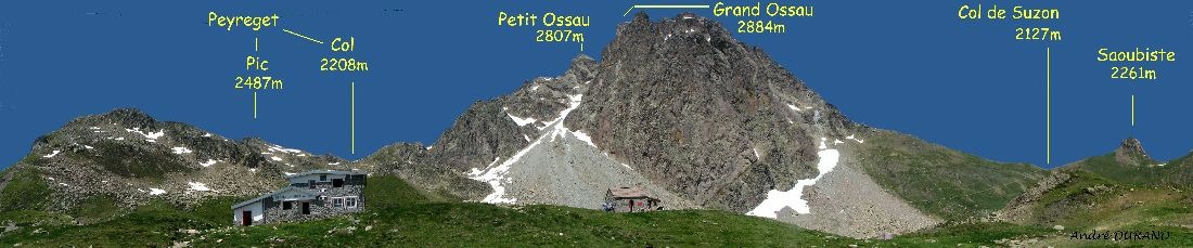 Pic et col de Peyreget, petit et grand pic du Midi d'Ossau avec la pointe d'Aragon qui semble être le point culminant et au premier plan, le refuge de Pombie.