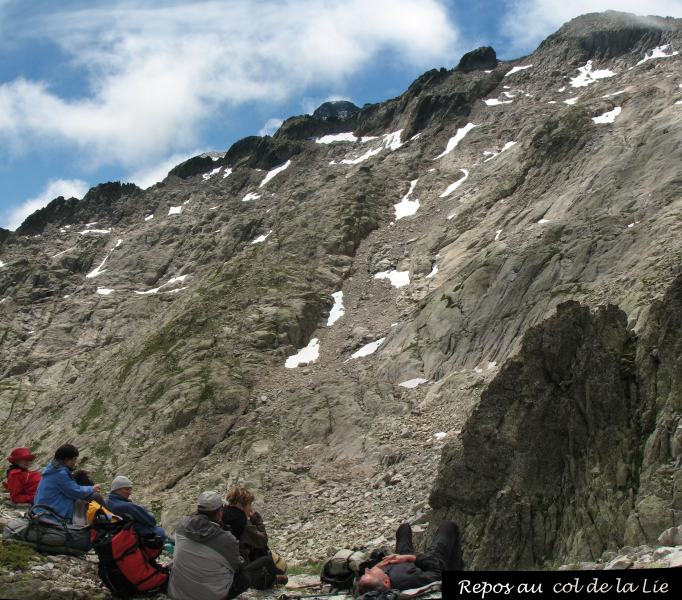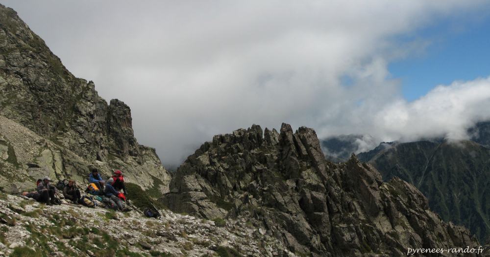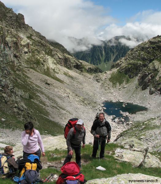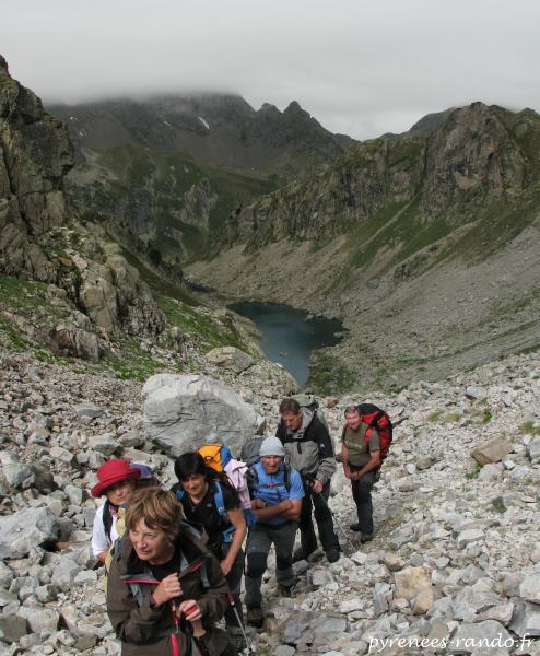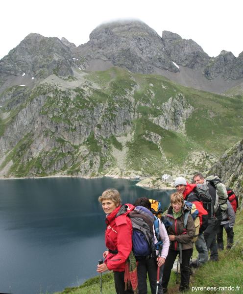 Le lac d'Artouste dominé par le pic de Lurien la tête dans les nuages.