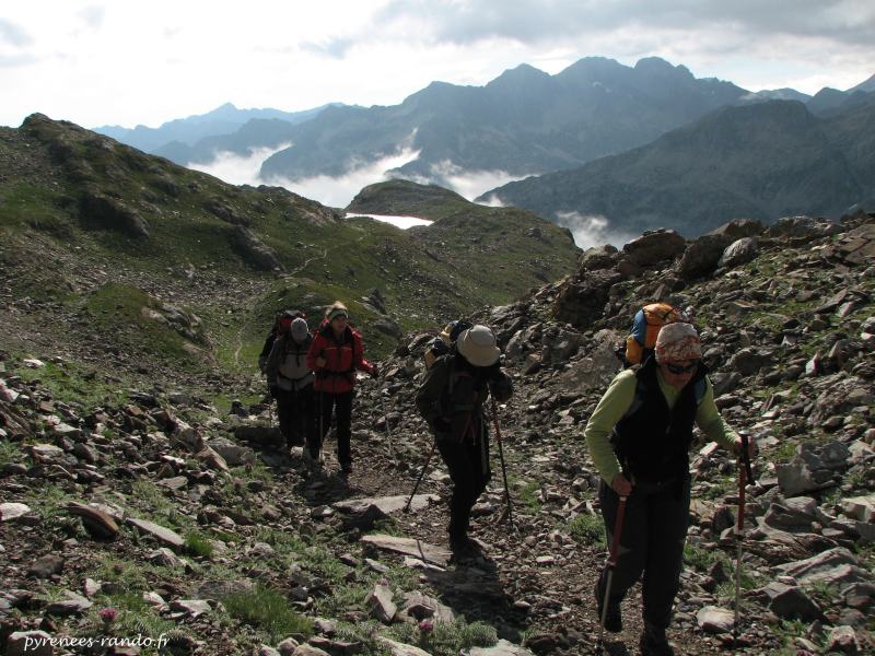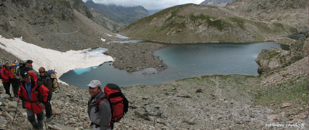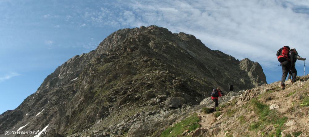 Ascension de la Fâche avec le massif du Balaïtous en arrière plan et les lacs de la Fâche (côté espagnol)