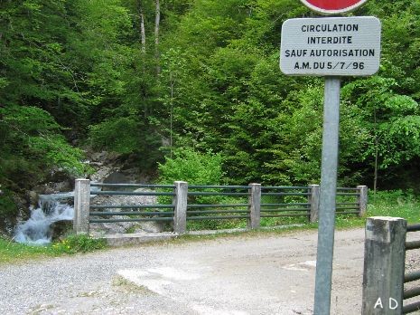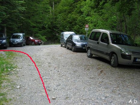 Fin de la piste autorisée (1.6km), garer la voiture, prendre le large sentier à gauche en montant, face au pont (itinéraire du retour).