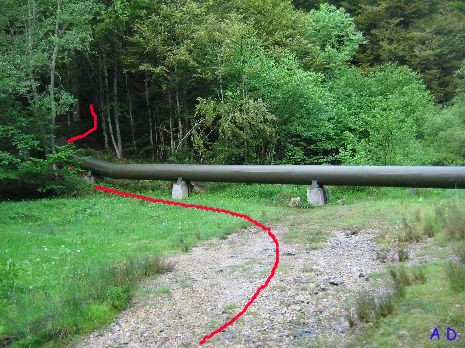 Surprise! Une conduite barre le chemin, prendre à gauche, passer dessous, et à partir de là, la pente devient rude, le sentier disparaît et laisse place à une sente qu'il faut parfois deviner.