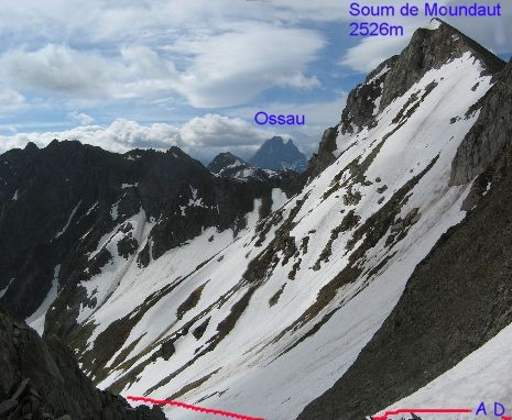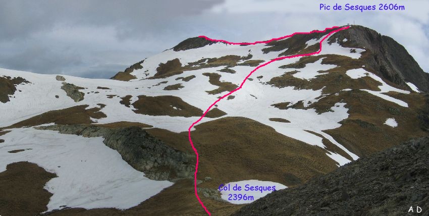 Par le couloir de gauche, on débouche 20m au-dessus du col de Sesques, et l'on aperçoit le cheminement