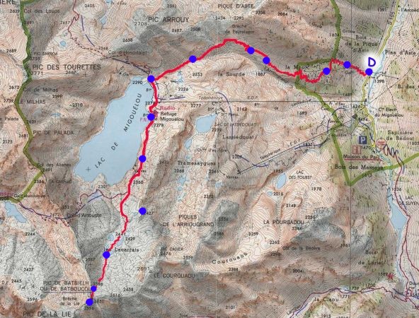 Remarque : ATTENTION, le topo guide Vignemale-Balaïtous de G. Véron (Hautes Pyrénées) contient une erreur page 36 randonnée 16b. IL n'est pas possible de suivre la crête depuis le pic de Batboucou jusqu'au pic de Courouaou. En effet de nombreux gendarmes en barrent la progression et demandent de mettre en oeuvre des techniques d'escalade. L'accès aux pics de Courouaou et Cadier (Voir photo) se fait par un couloir et sollicite un pied montagnard...