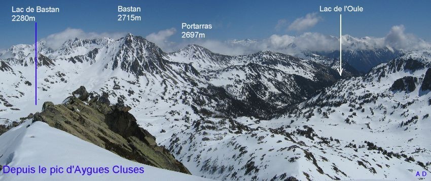 Pic d'Aygues Cluses , Panorama Est : vallée du Bastan menant au lac de l'Oule avec le lac et le pic de Bastan,