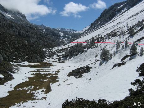 Au dessus du ressaut de Pountou, s'ouvre la vallée d'Aygues Cluses. Pour profiter de la neige, nous prendrons le flanc de la rive gauche.