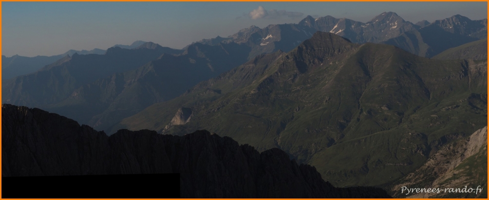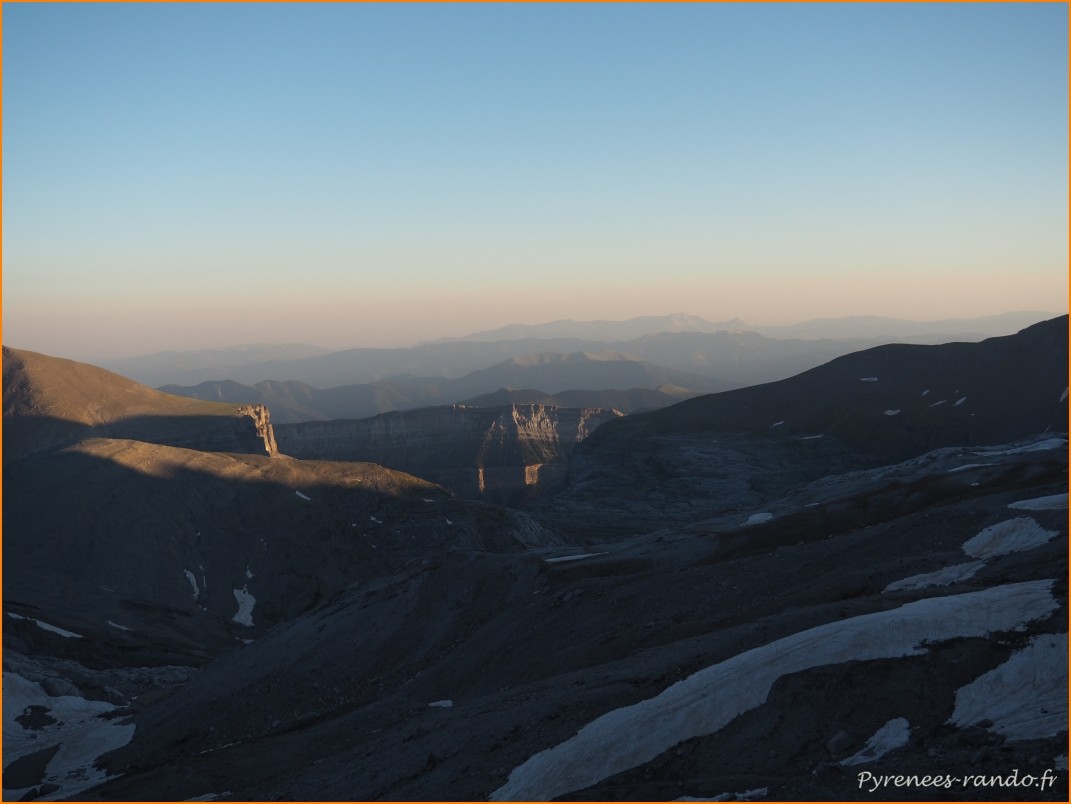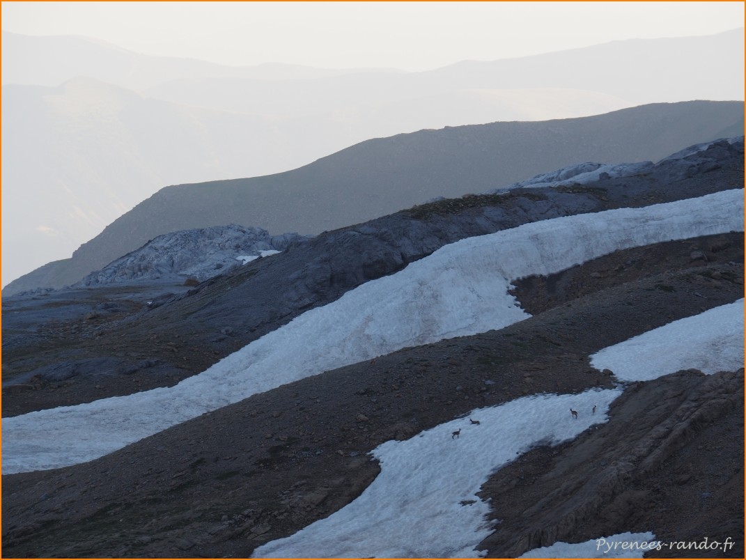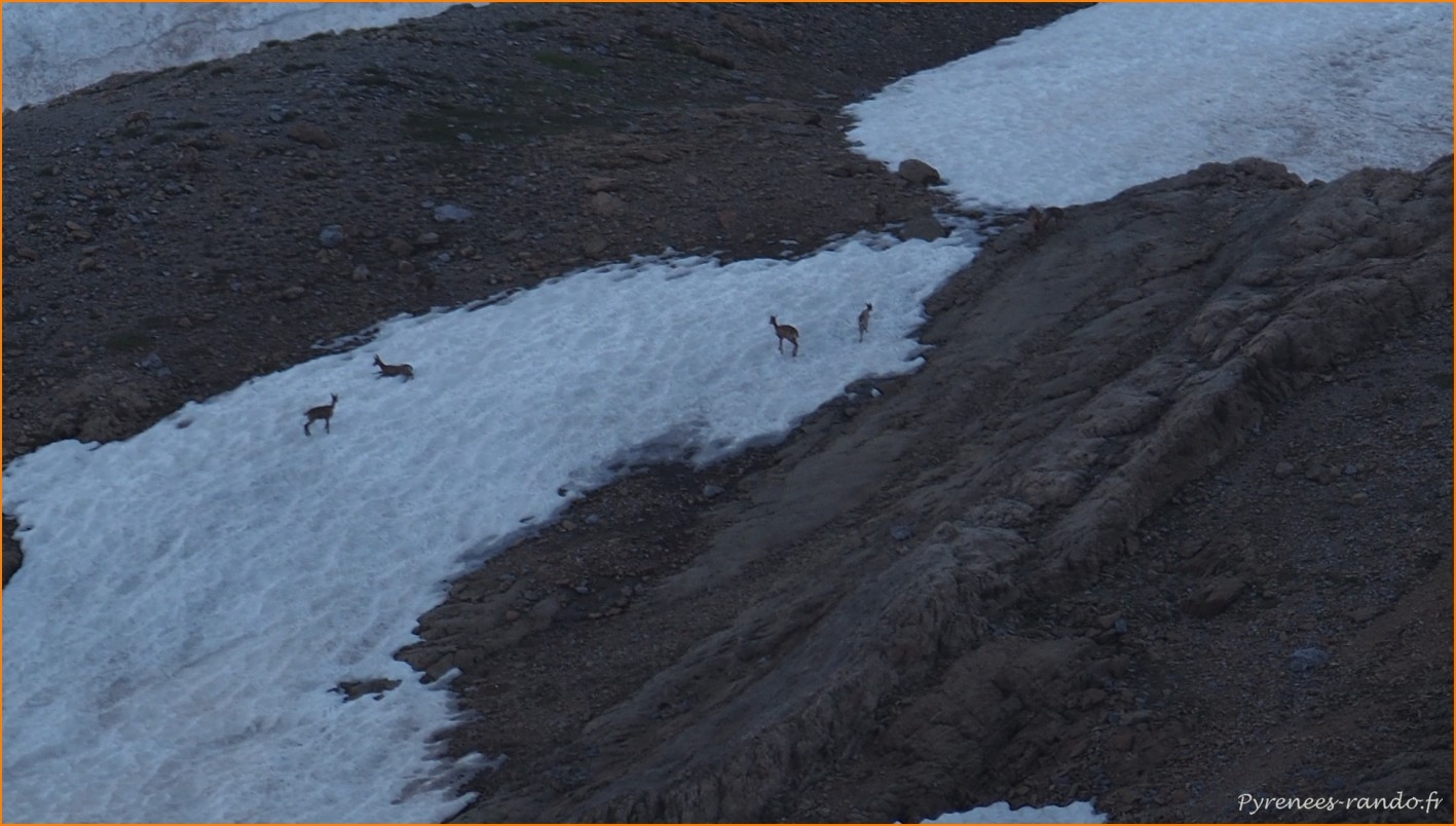 Une harde d'isards qui joue sur un névé avant la nuit.