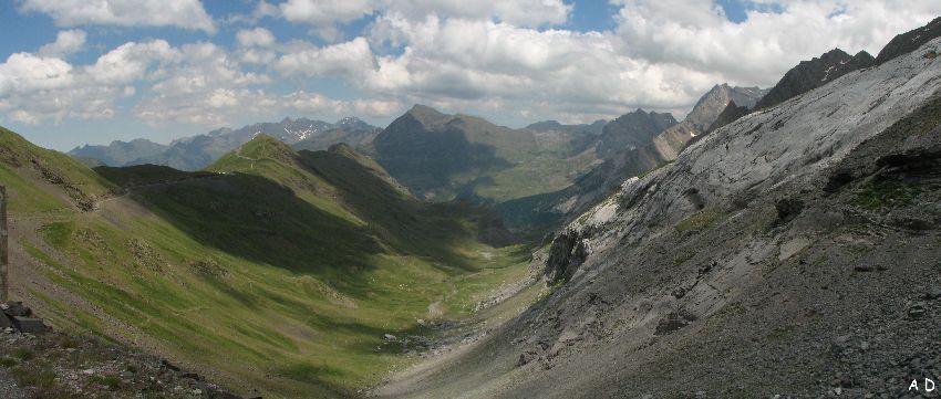 . . Depuis le col de Boucharo, la vallée des Pouey Aspé menant à Gavarnie. Elle a permis pendant des années les échanges inter frontalier entre le Village de Gavarnie (France) et Torla (Espagne). (Cliquez sur la photo pour afficher la légende) |