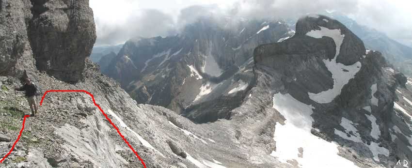 Un cheminement par des vires permet d'atteindre facilement le sommet.