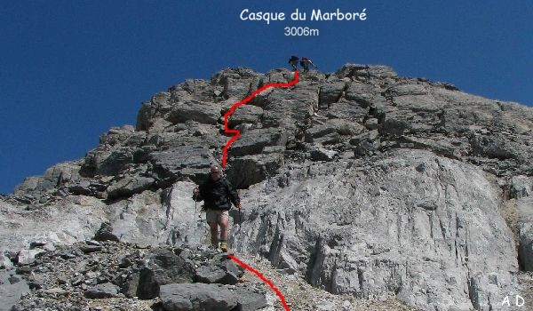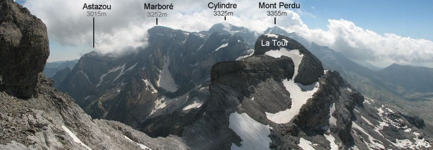 Un coup d'oeil à l'est avant de grimper le ressaut terminal, le Marboré, le Cylindre et le Mont Perdu apparaissent.