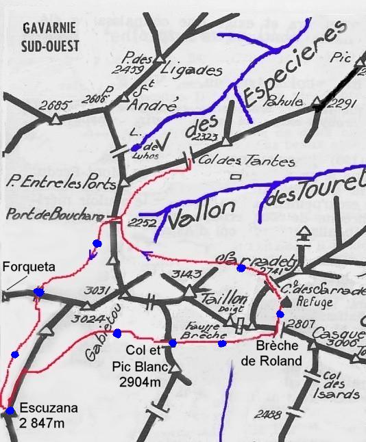 partir de là, retour à la civilisation, descendre sur le refuge des Sarradets, port de Boucharo par le chemin qui longe le pied des