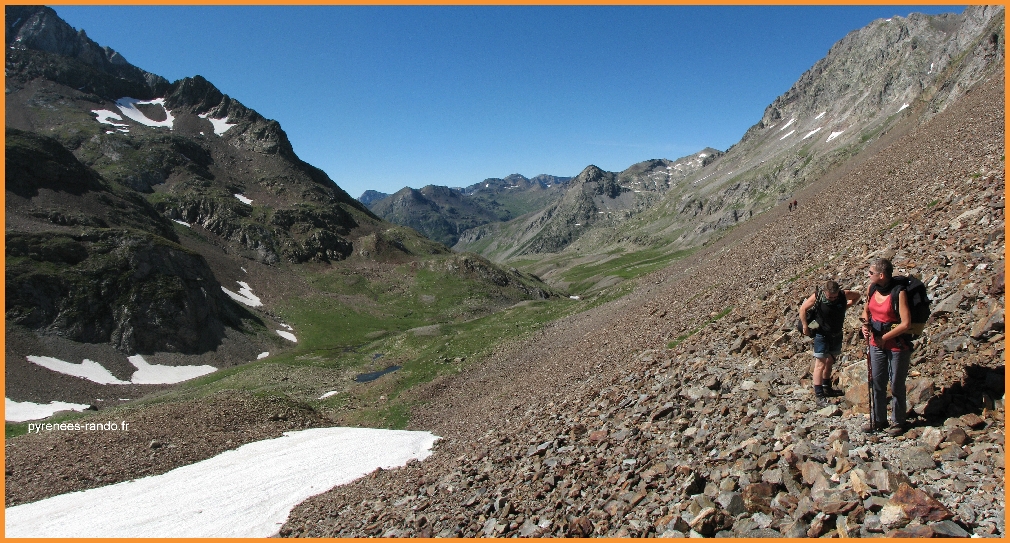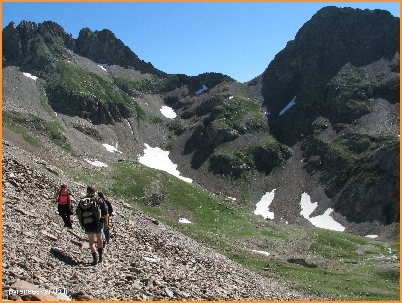 Le névé et le passage rocheux derrière nous, nous remontons vers le col des Mulets.