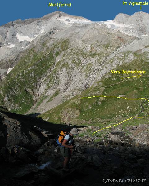 Sente au pied du torrent sous la domination du Montferrat 3219m et du Pt Vignemale 3032m.