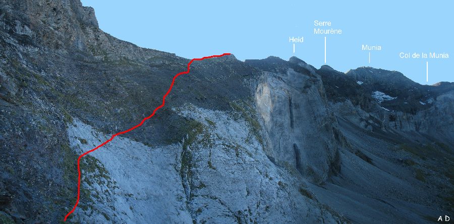 Puis lorsque l'on bute sur le Gerbats, changement d'ambiance, il faut plonger vers les parois du cirque de Troumouse pour éviter l'éperon du Gerbats (suivre les cairns). (Cliquer sur la photo pour enlever la légende)