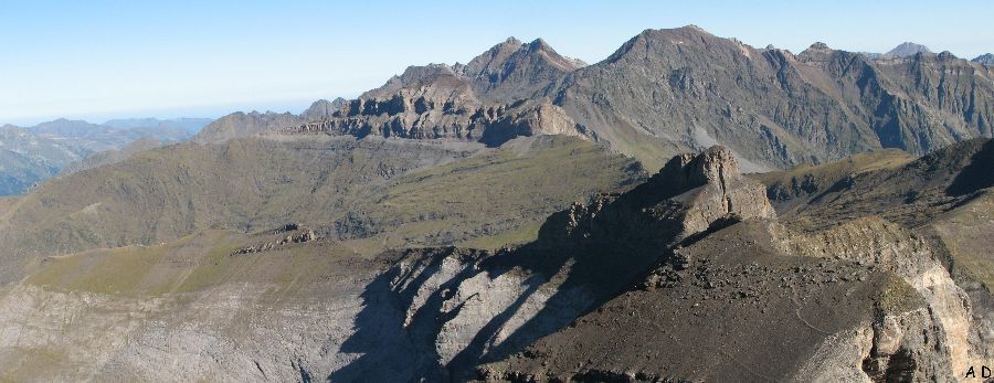 Devant, les difficultés approchent : pic de Troumouse, Serre-Mourène. (Cliquer sur la photo pour afficher la légende)