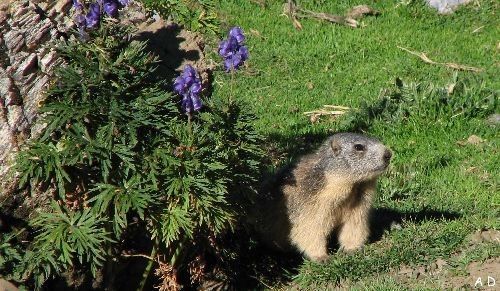 la marmotte épie les randonneurs au détour d'un bouquet d'Aconit Napel,