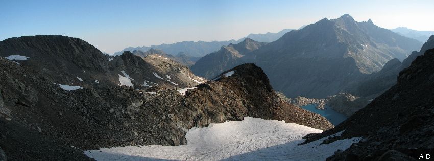 De la brèche d'Estibère-Male Est, un coup d'oeil derrière nous: le lac Tourrat s'éloigne 400m plus bas, dominé par le massif du Néouvielle par l'imposante face nord du Pic Long