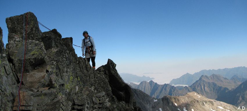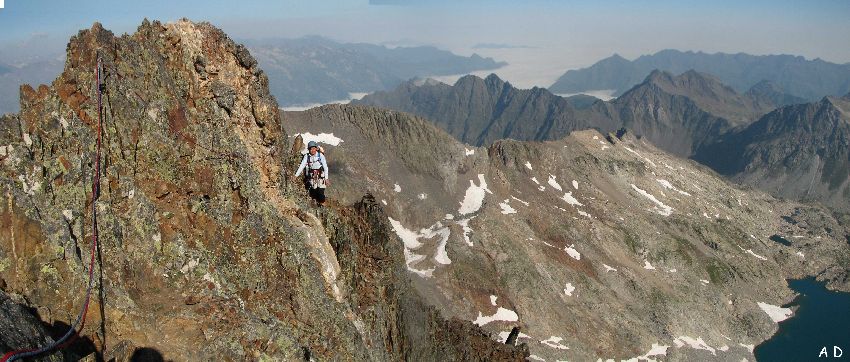 Sur l'arête occidentale du pic Long, accompagné par un premier qui vous rassurera, sans jamais être difficile, celle-ci mérite quand même de l'attention ( rocher de mauvaise qualité et quelques passages aériens), mais dans l'ensemble sentiment d'être dans un lieu exceptionnel. |