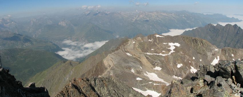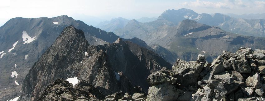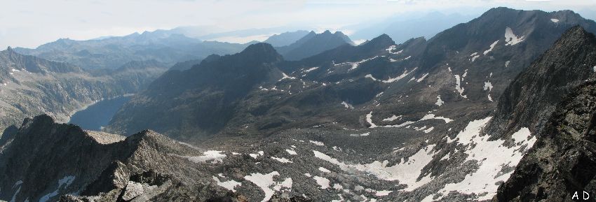 Et vers le sud, notre prochain objectif, le pic de Badet 3160m, avec en arrière plan, Campbieil, Gela, Munia, soum des Salettes. (Cliquez sur la photo pour afficher la légende) |