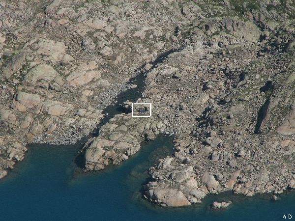 et tout en bas, au bord du lac Tourrat, la tente du bivouac qu'il faudra récupérer ce soir. |