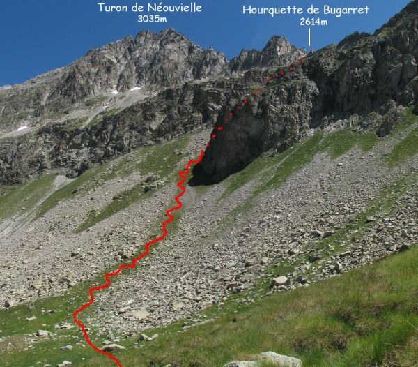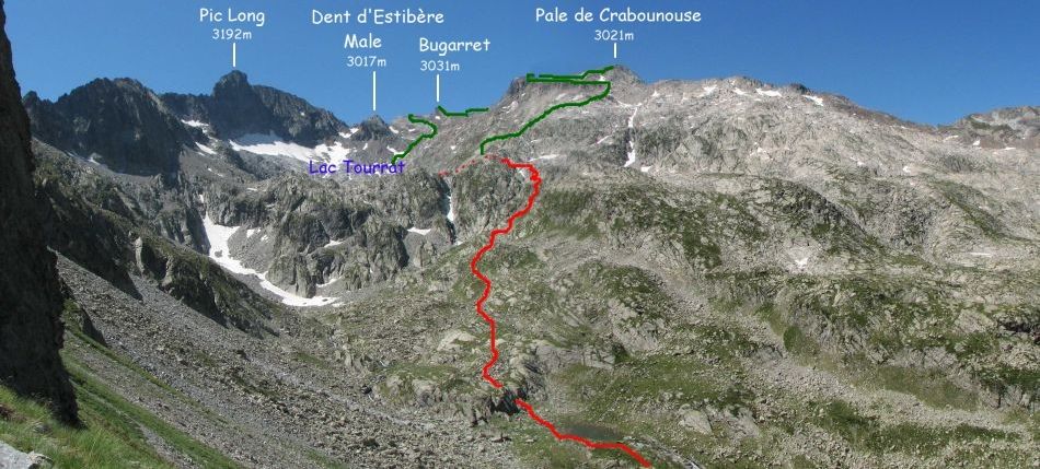 Pic Long 3192m, Dent d'Estibère Male 3017m, , Bugarret 3031, et Pale de Crabounouse 3021m forment le cirque abritant le lac Tourrat. (Cliquer sur la photo pour afficher la légende) |