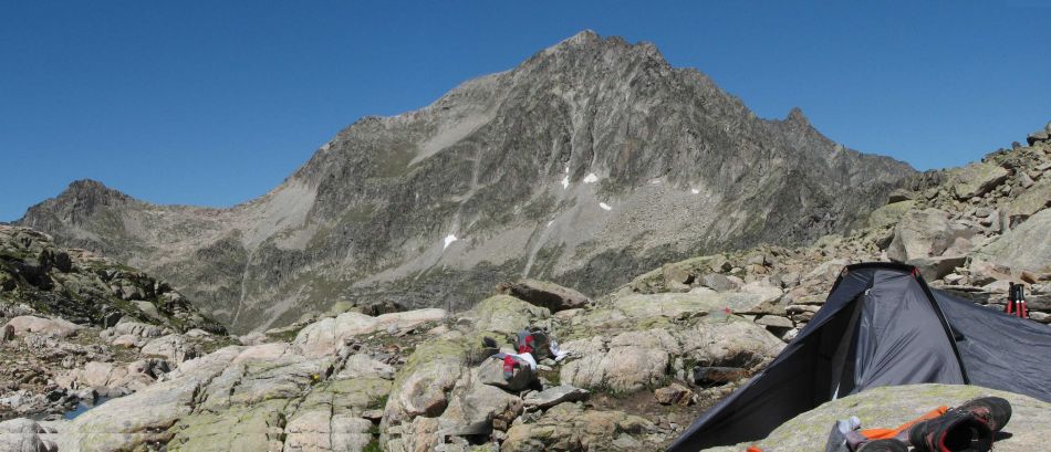Installation du bivouac aux abords du déversoir du lac Tourrat, avec le Turon de Néouvielle en fond. |