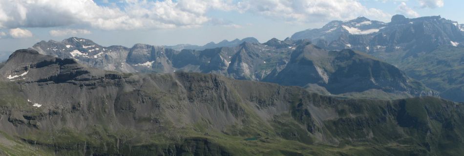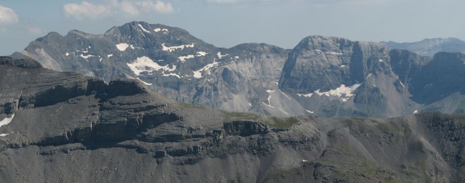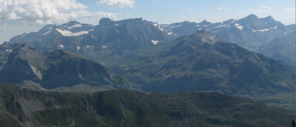 Et depuis la crête, Mont Perdu, Cylindre, Astazou, Marboré, la Tour, le Casque, la Brèche, le Taillon et le Gabiètou avec en 1er plan le Piméné sous le Casque.
