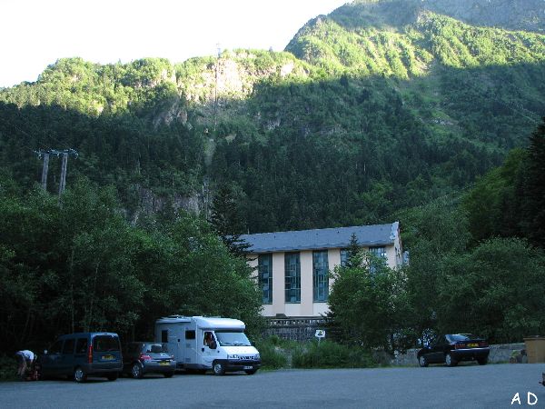 Le parking du Pont de Prat 1230m avec sa centrale hydroélectrique de Tramezaïgues, fond de vallée fermée par les pics de Crabé , du Midi de Genos 2445m, de Pichadères 2550m