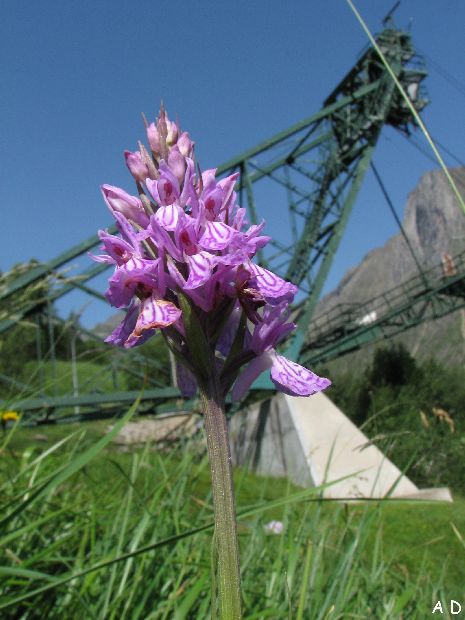 Une Orchidée avec en arrière plan le téléphérique à pylône unique, véritable prouesse technique dessiné par l'ingénieur Bleichert.