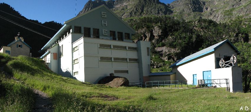 Les installations de la Soula . La SHEM (Sté Hydroélectrique du Midi) existent depuis 1929. A l'origine, la Compagnie des Chemins de Fer du Midi avait entrepris, avant la guerre de 1914, l'électrification de son réseau. L'absence d'usine de production d'électricité l'obligea à construire elle-même des centrales. La S.H.E.M. a choisi la haute vallée du Louron car celle-ci présentait un fort potentiel hydraulique. Total du groupement des centrales de la vallée du Louron : puissance installée 60MVA Productible 100GWH (100 millions de KWH). Les rapports ont toujours été remarquables entre cette entreprise et les habitants de la vallée : les services rendus sont de coutume ici, dans ce milieu montagnard où viennent paître les troupeaux. |