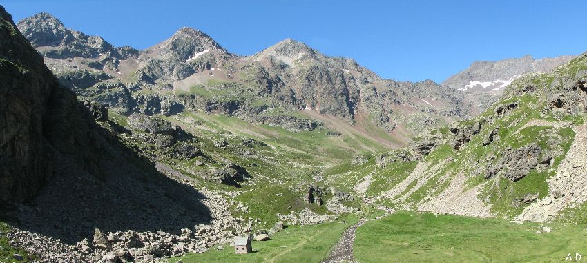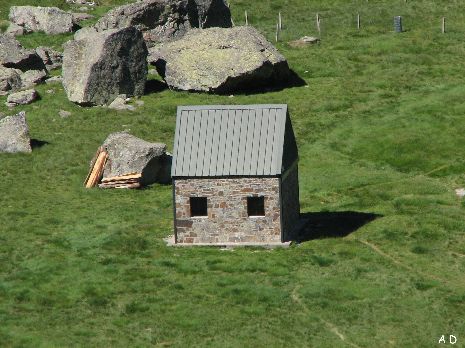 Cabane rénovée pouvant servir de bivouac, à l'entrée du vallon d'Aigues Tortes (Ne comptez pas sur la cabane du lac de Pouchergues car elle n'existe que sur la carte). |