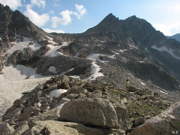 Le bivouac installé, une fois restaurés, nous partons pour la Fourche de Clarabide.. Il suffit de suivre la moraine du lac vers l'ouest pour atteindre le col.