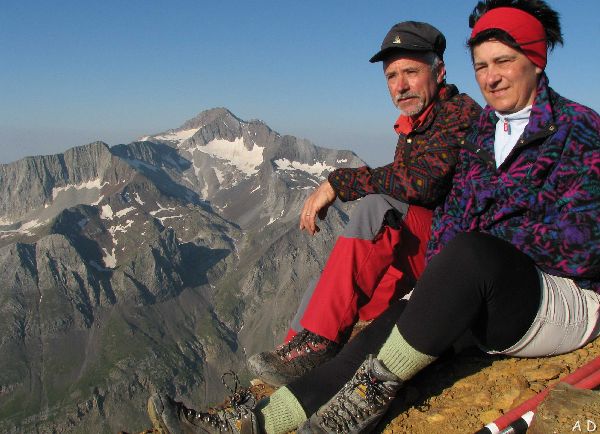 Pose au sommet de Clarabide SO avec les Posets en arrière plan.