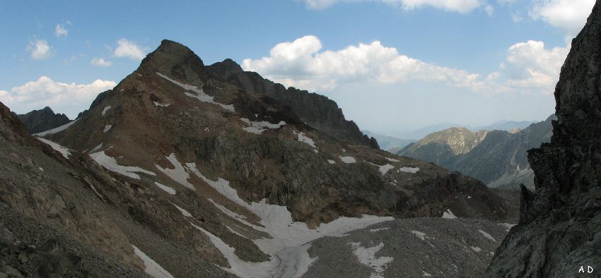 Depuis le port d'Oô 2908m, le col des Gourgs Blancs 2872m et le pic Gourdon 3034m avec les Spijeoles 3066m en arrière plan . (Cliquez pour afficher la légende)