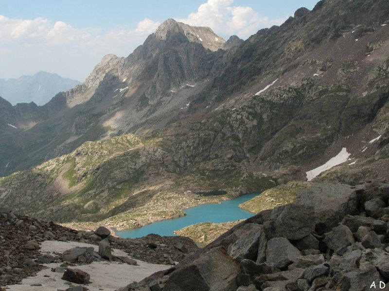 Le lac du Milieu depuis la moraine frontale, dominé par le pic Hourgade, la descente sur le plateau reste pénible de part la structure du terrain (gros blocs, éboulis).
