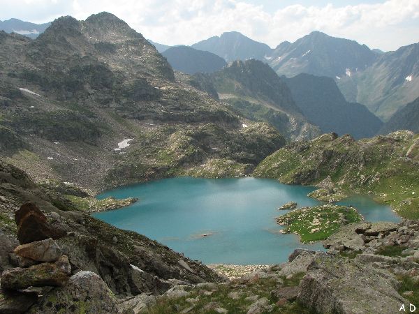lac avec vue sur le lac des Isclots 2398m et ses îles très